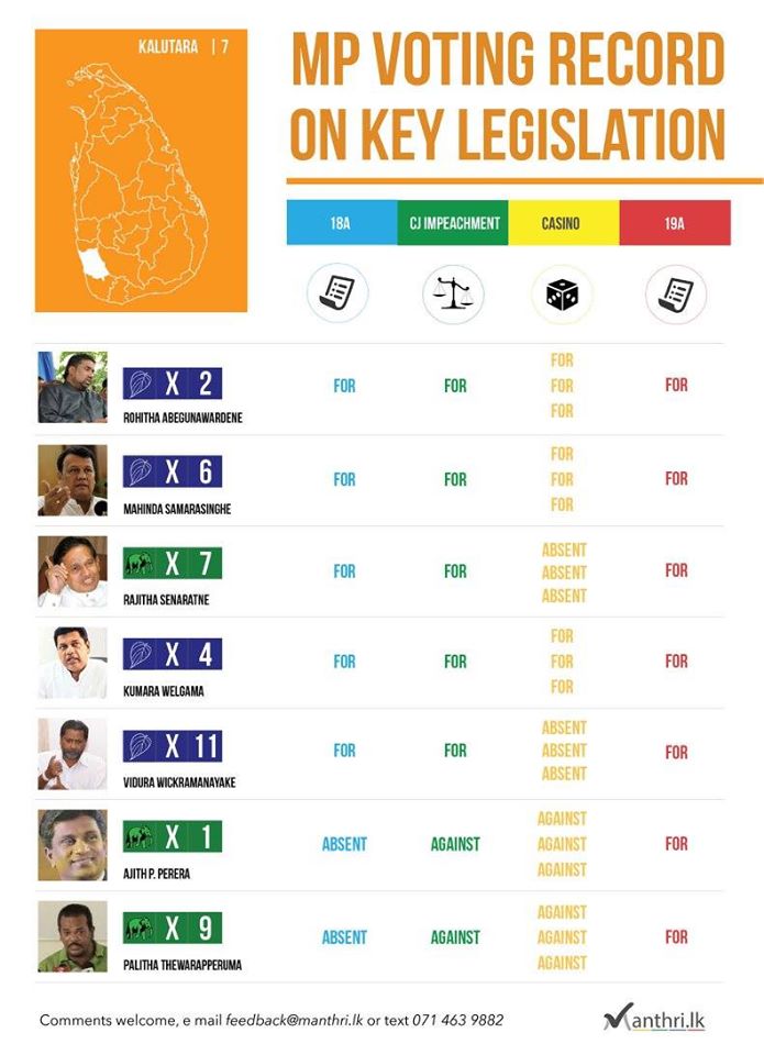 This infographic depicts Kaluthara District MPs voting record on 18th Amendment, CJ Impeachment, Casino and 19th Amendment.