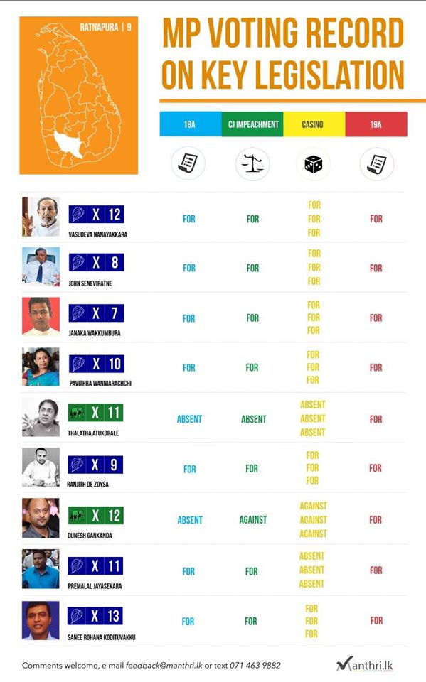 This infographic depicts Rathnapura District MPs voting record on 18th Amendment, CJ Impeachment, Casino and 19th Amendment.