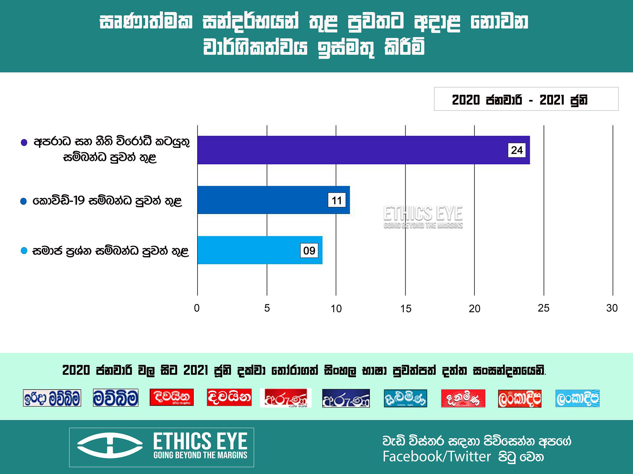 An infographic showing Divaina daily, Sunday Divaina, Mawbima daily, Sunday Mawbima, Aruna daily, Sunday Aruna, Lankadeepa daily and Sunday Lankadeepa, Dinamina and Silumina highlighting ethnicity in negative contexts from January 2020 to June 2021.