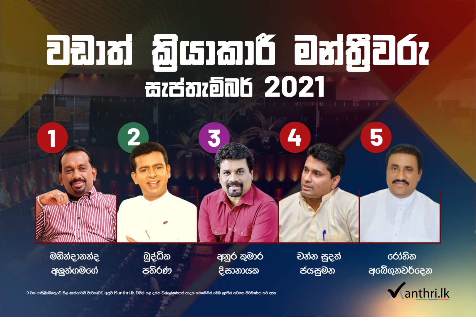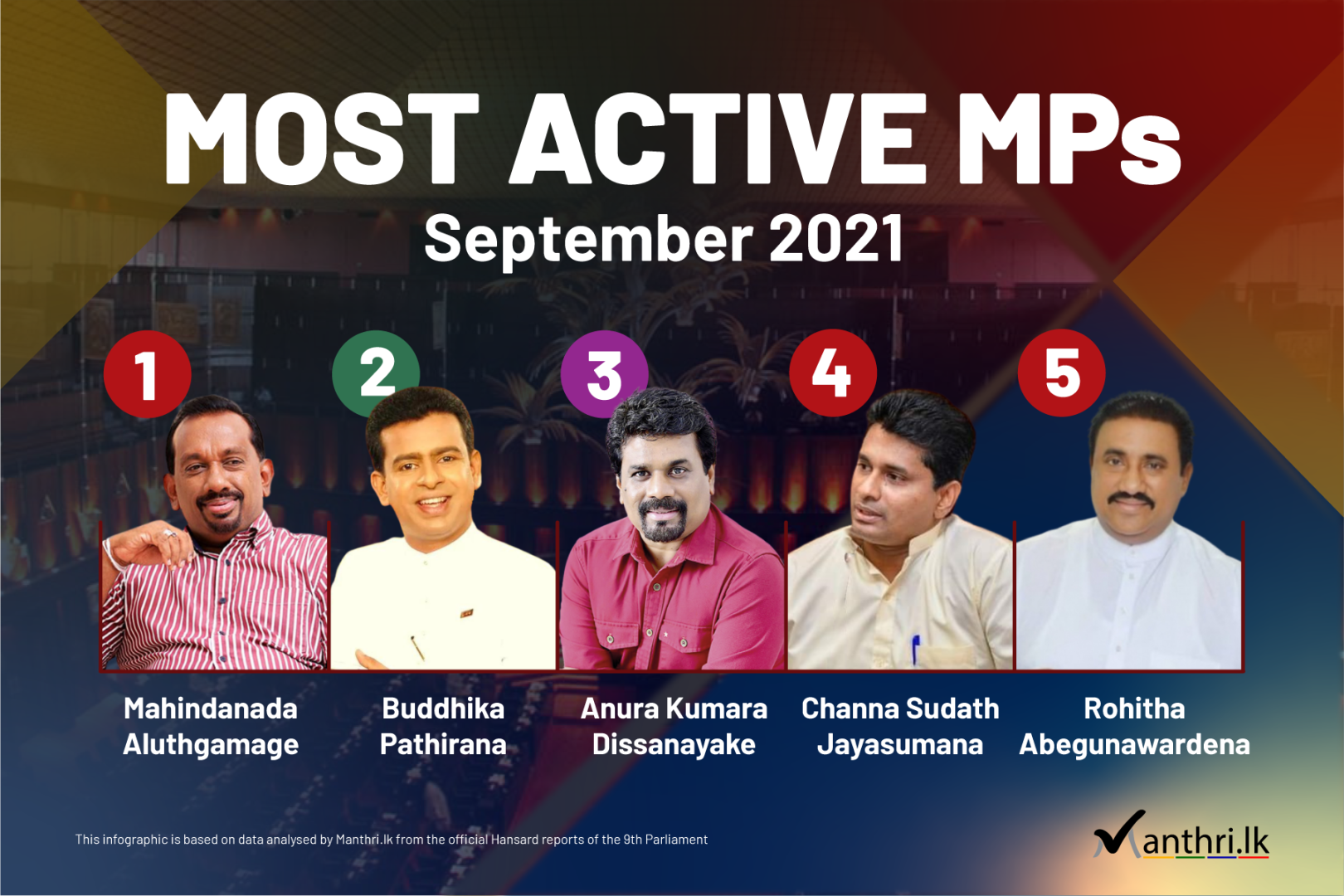 This infographic shows the most active MPs in the 9th Parliament in September 2021. They are Mahindananda Aluthgamage (SLPP), Buddhika Pathirana (SJB), Anura Kumara Dissanayaka (JJB), Channa Sudath Jayasumana (SLPP) and Rohitha Abegunawardhana (SLPP).