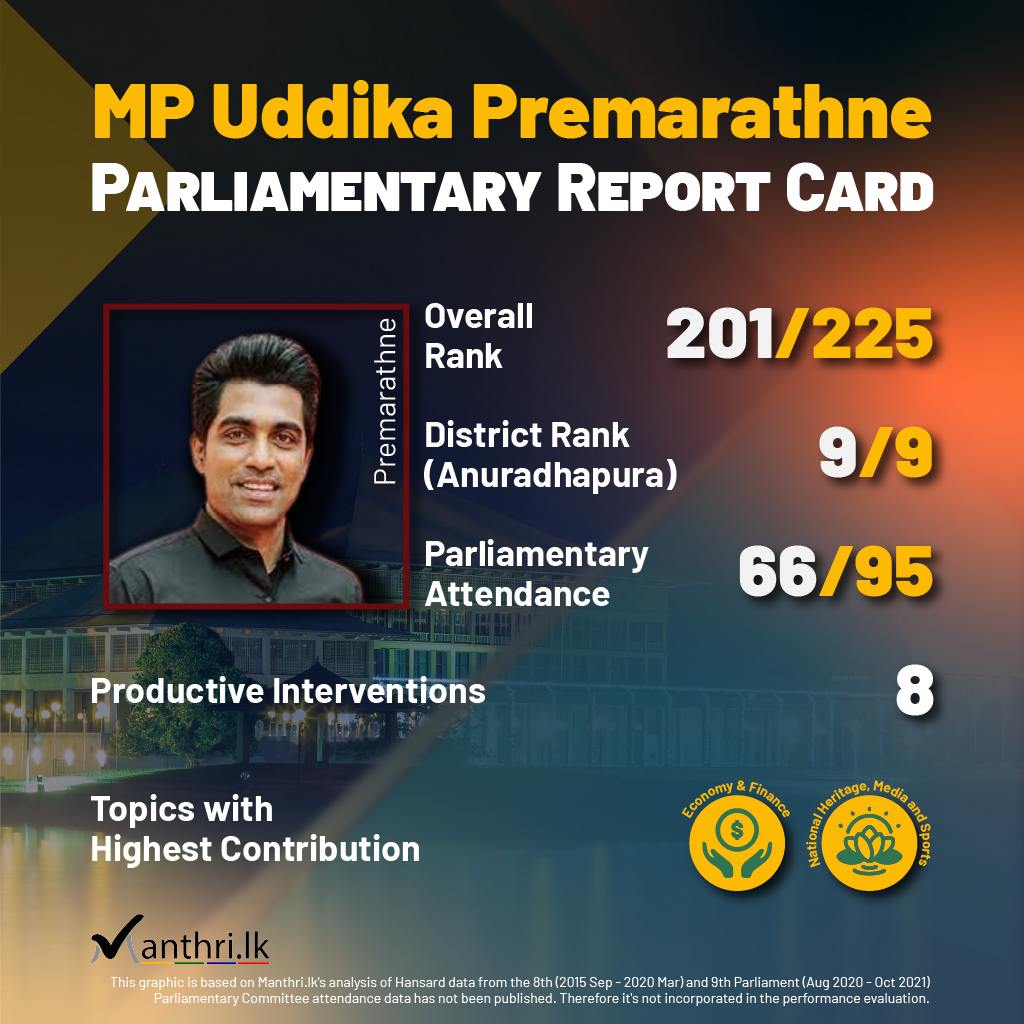 This report card shows the contribution of MP Uddika Premarathne (SLPP) in the 9th parliament. It is based on analysis of Hansard data from August 2020 to October 2021. This includes attendance in parliament sittings (66/95), total number of productive interventions he made in parliament (8) and topics which were discussed most by him in the parliament i.e. Economy and Finance; National Heritage, Media and Sports;