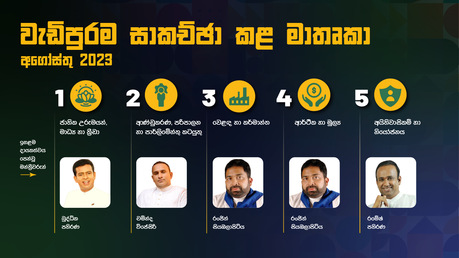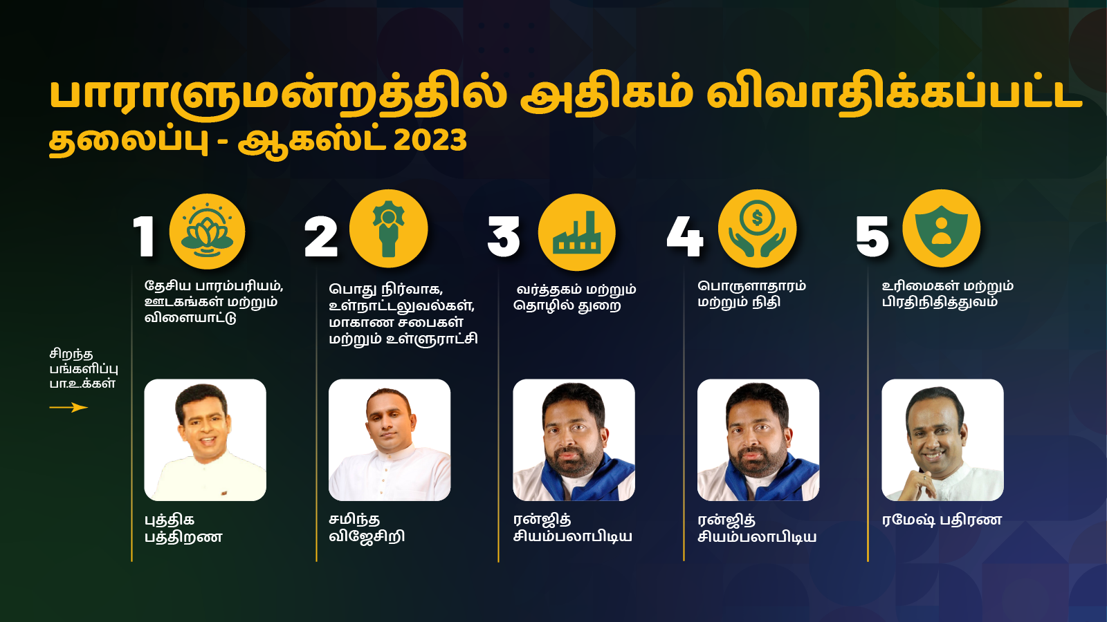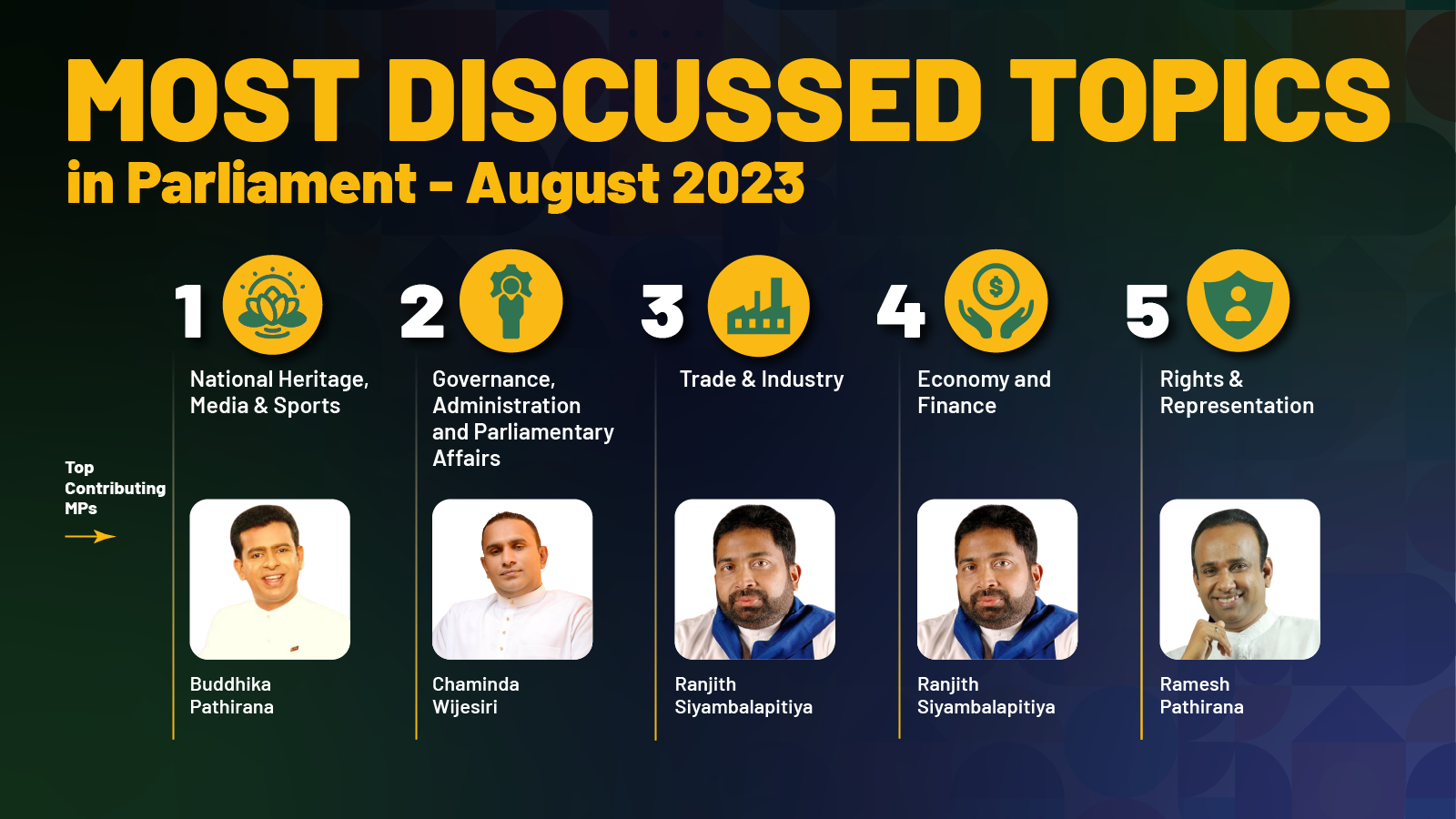 This Infographic shows the most discussed topics in the 9th Parliament in August 2023 and the MPs who contributed the most to those topics. Topics and contributors are National Heritage, Media and Sports (Buddhika Pathirana - SJB), Governance, Administration and Parliamentary affairs (Chaminda Wijesiri - SJB), Trade and Industry (Ranjith Siyambalapitiya - SLPP), Economy and Finance (Ranjith Siyambalapitiya - SLPP) and Rights and Representation (Ramesh Pathirana -SLPP).