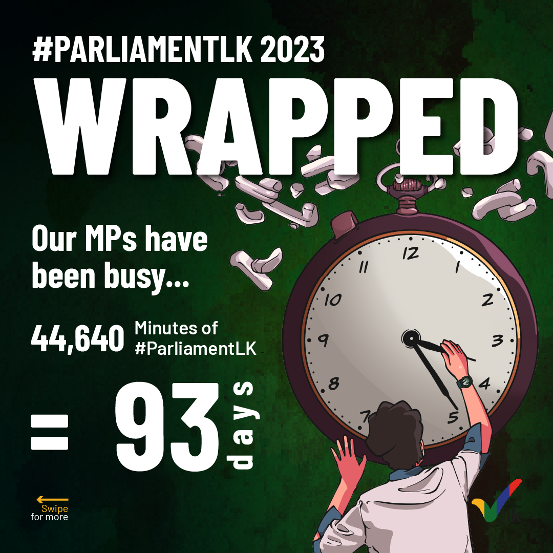 On 13 December, parliament completed proceedings for 2023 with the conclusion of the committee stage debates of Budget 2024. This infographic analysed how parliament utilised their time, including the top 5 MPs that had the highest attendance and performance in parliament. Across 105 sittings, MPs have spent 50,400 minutes in parliament. During 2023, parliament has tabled 53 bills out of which only 25 were passed. MPs also debated several topics, out of which the most discussed topics included Economy & Finance (27.6%); Governance, Administration and Parliamentary Affairs (18.7%); Justice, Defence and Public Order (12%); Urban Planning, Infrastructure & Transportation (8.8%); Trade & Industry (5.8%). MPs with the highest attendance included Dinesh Gunawardena (SLPP), Jayantha Ketagoda (SLPP), Upul Mahendra Rajapaksha (SLPP) and Yadamini Gunawardena (SLPP). Further, the MPs with the most productive contributions included Ranjith Siyambalapitiya (SLPP), Susil Premajayantha (SLPP), Sajith Premadasa (SJB), Lakshman Kiriella (SJB) and Premnath C. Dolawatte (SLPP).