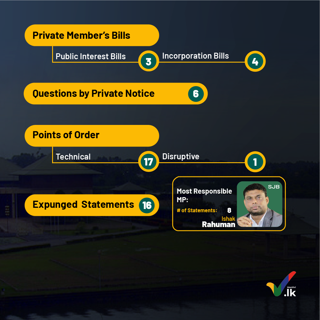 This infographic includes the summary of parliament in May 2024. There were 7 parliament sittings in May 2024. During the 7 parliament sittings, 55 written questions were asked but only 32 were answered. There were 3 motions at the adjournment time. 15 announcements were made by the Speaker during the 7 parliament sittings. The number of Bills, Regulations and Orders were 13,5 and 3 respectively. There were 6 questions by the Private notice at the parliament in May 2024. 18 Points of order were raised in total, and 17 points of order were ruled as technical points of order. Only 1 was ruled as disruptive point of order in the parliament during this month. 16 statements were considered as expunged statements at the parliament. Ishak Rahuman was the most responsible MP for the expunged statements at the parliament in May 2024.