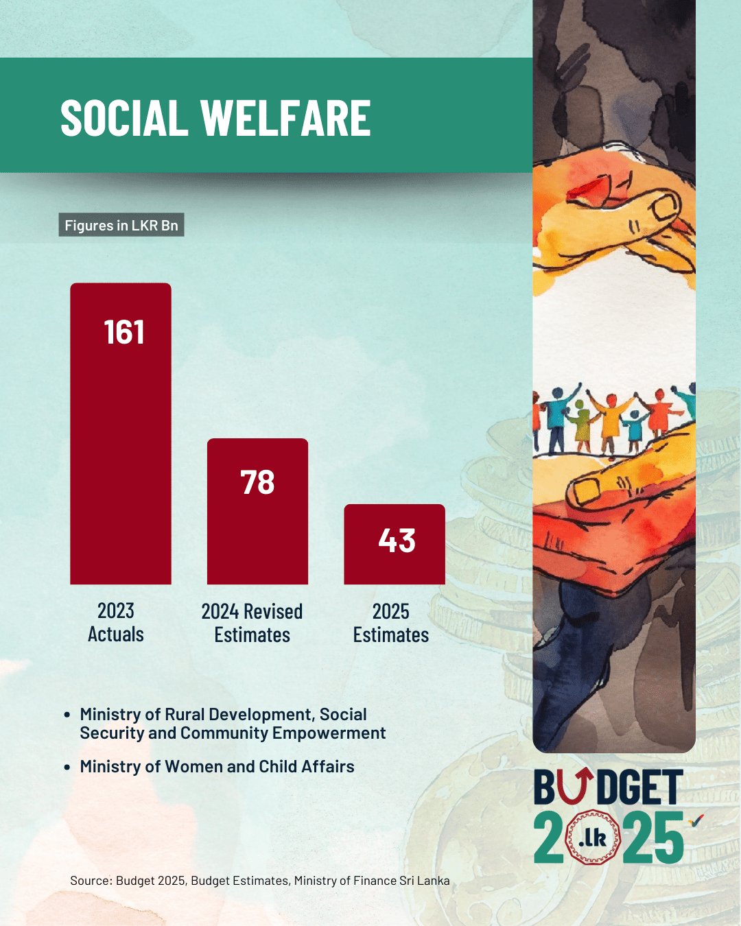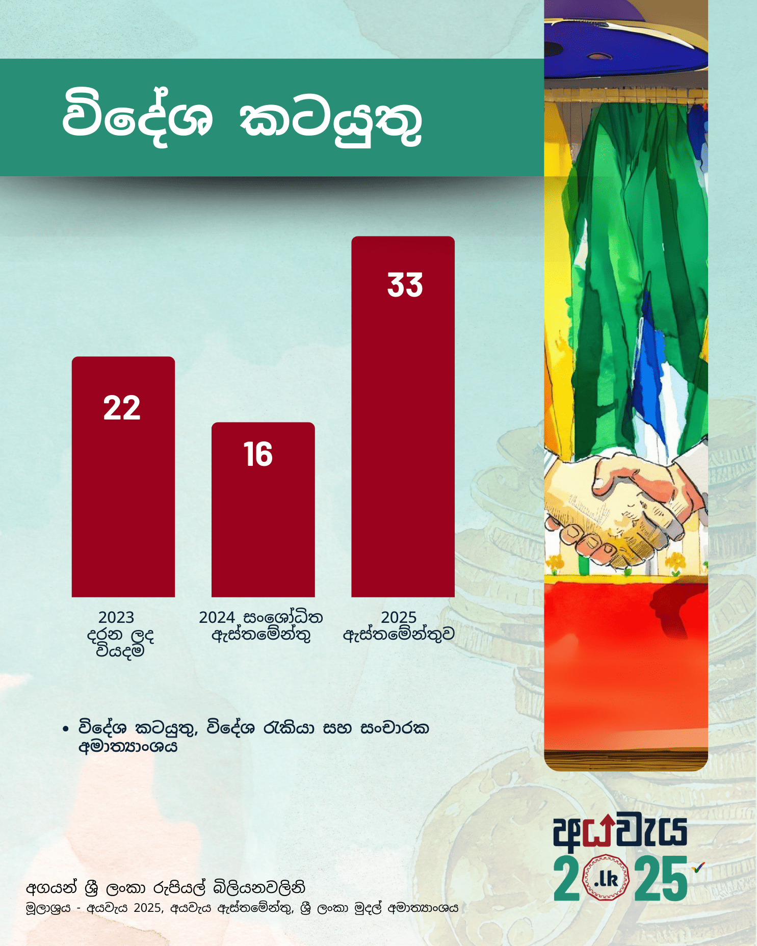On 17 February, President Anura Kumara Dissanayake delivered his first budget speech for the 2025 fiscal year. The speech outlined how the government plans to allocate expenditure across nine sectors of the economy: agriculture, defense, education, environment, finance, foreign affairs, health, infrastructure, and social welfare. Finance, infrastructure development, and health sectors receive the largest share of the allocation.