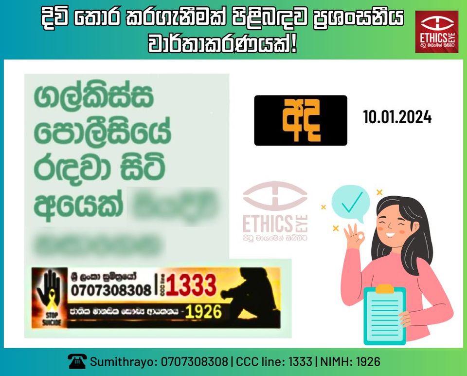 On January 10, 2024, the "Ada" newspaper reported on the suicide of an individual detained at the Mount Lavinia Police Station. The article included helpline numbers, which is commendable and reflects responsible reporting.