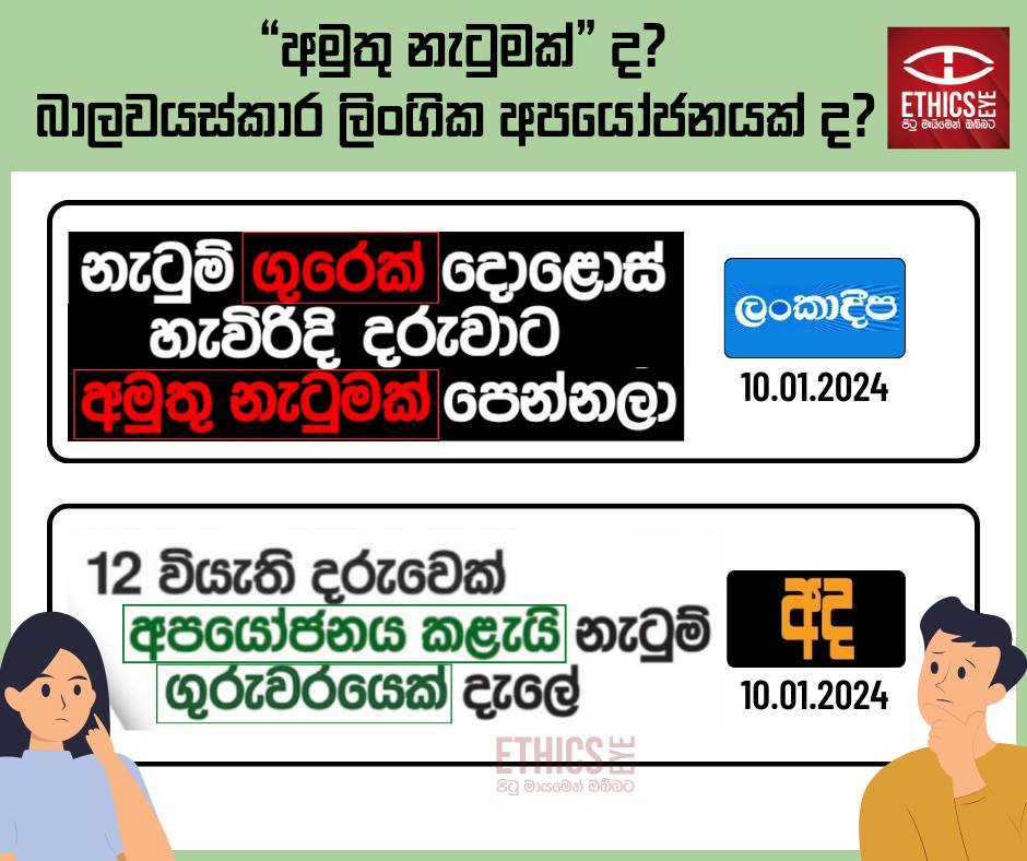 On 10 January 2024, both Lankadeepa and Ada newspapers reported an incident involving the abuse of a 12-year-old girl by a dance teacher. Lankadeepa carried a trivializing headline, using the phrase “Amuthu Natumak” (අමුතු නැටුමක්), and the derogatory term "Gurek" (ගුරෙක්). Including a suspect's profession in headlines with derogatory language may contribute to the marginalisation of that profession. Even in cases involving serious offences, media is advised to maintain neutrality in their coverage and avoid terminology that negatively emphasises a particular profession. In contrast, Ada reported the same news in an ethical manner, avoiding trivialisation of the incident by using the appropriate term “Apayojanaya” (අපයෝජනය) and referring to the accused as “Guruwarayek” (ගුරුවරයෙක්).