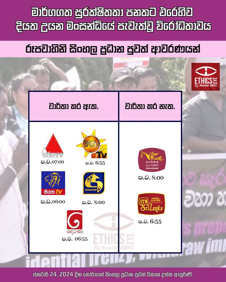 On January 24, 2024, the Socialist Youth Union and Civil Society Organisations held a protest against the Online Act on the Security of Online Systems at the Diyatha Uyana intersection in Baththaramulla. Sirasa, Hiru TV, Siyatha, Swarnawahini and TV Derana reported the protest during their prime Sinhala news bulletins on the same day. Rupavahini and ITN did not cover the event.