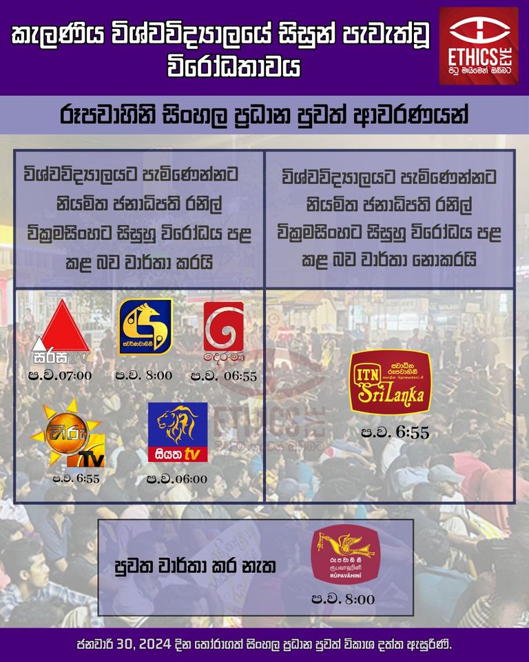 On January 30, 2024, television news channels reported that police used tear gas and high-pressure water cannons to disperse a protest by the Kelaniya University Students' Union on January 29, 2024. It was held against the university administration's decision to invite President Ranil Wickremesinghe to the opening ceremony of a new building. Sirasa, Swarnawahini, TV Derana, Hiru TV, and Siyatha reported the story and clearly stated the reason during their prime Sinhala news bulletins. ITN reported the incident without mentioning the reason, while Rupavahini did not cover the story.