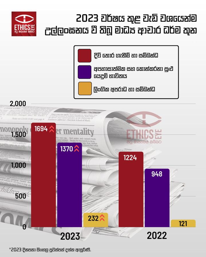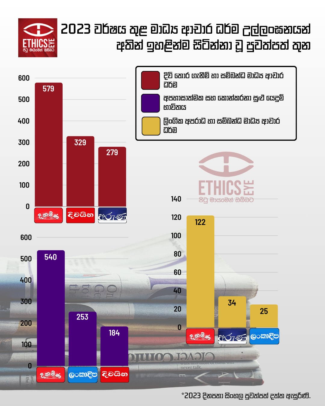 On January 30, 2024, the Ethics Eye team published two infographics featuring charts that compare the instances of the three most violated media ethics in 2023 and the three newspapers with the highest number of media ethics violations in 2023. These infographics showed that most violations involved reporting on suicide incidents, followed by the use of derogatory language and coverage of sexual crimes. Dinamina reported the highest number of violations in all three categories. Divaina and Aruna ranked second and third, respectively, in the suicide category. Lankadeepa and Divaina held the second and third positions for derogatory language violations, while Lankadeepa and Aruna ranked second and third for coverage of sexual crimes.