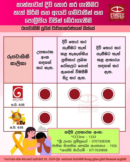 On May 30, 2024, TV Derana and Hiru TV reported that a woman attempted suicide and was rescued by villagers and the police. Both channels did not mention any helpline numbers in their reporting and described how she attempted suicide, while TV Derana also interviewed the woman, which violated media ethical guidelines. The media is advised to follow ethical guidelines even when reporting serious incidents such as suicides, sexual harassment and crimes, and to refrain from reporting in a negative or sensationalist manner.