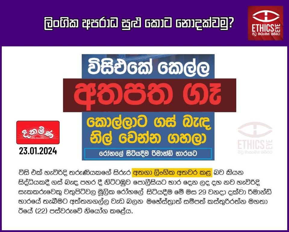 On January 23, 2024, the Dinamina newspaper reported an incident in which a person was arrested for allegedly sexually harassing a 21-year-old woman. In the headline, the newspaper used the derogatory term “Athapatha Ge” (අතපත ගෑ) to describe the incident. It not only minimises the severity of sexual assault but it also dangerously trivialises a sexual crime, allowing such offenses to be normalised within society. When reporting on events that are legally classified as crimes or significant social issues it is a violation of media ethics to include headlines or content that trivialises the crime or offense.
