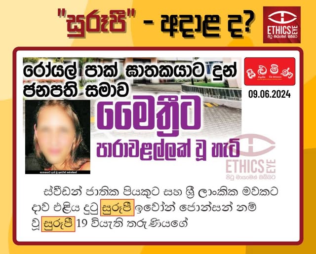 On June 9, 2024, the Silumina newspaper reported the tragic death of a 19-year-old woman. The report referred to the deceased woman using the term “surupi” (සුරූපී), which contributes to harmful stereotypes and sexual objectification of women, thereby violating media ethics.