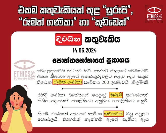 On June 14, 2024, the Divaina newspaper published an editorial that violated media ethics by using inappropriate language. The editorial included terms such as “Rumath” (රූමත්) and “Suruupi” (සුරූපී), which contribute to the sexual objectification of women. It also used derogatory terms such as “Ganika” (ගණිකා) and “Kudda” (කුඩ්ඩා), which promote marginalisation and negative attitudes.