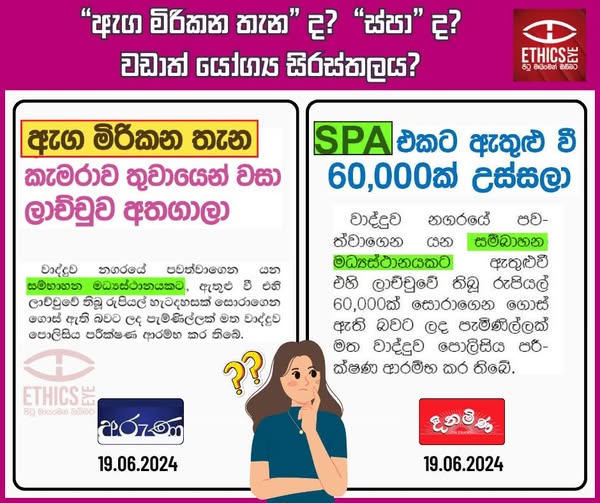 On June 19, 2024, Aruna and Dinamina newspapers reported a police investigation into a case of theft of money at a massage parlour in Wadduwa. In their headlines, Aruna used the derogatory term “Aga mirikana thena” (ඇඟ මිරිකන තැන), while Dinamina used the term “Spa” (ස්පා). However, both newspapers used the appropriate term “Sambahana madhyasthanaya” (සම්බාහන මධ්යස්ථානය) within the article content. The use of emotionally stirred or derogatory language in headlines violates media ethical guidelines.