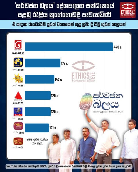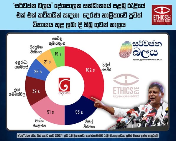 On June 18, 2024, the Ethics Eye team published two infographics presenting charts that compared the airtime allocated to reporting the first public rally of ‘Sarvajana Balaya’ during the prime-time Sinhala news bulletins, as well as the airtime given to individual speakers at the rally on the TV Derana channel. The infographics shows that TV Derana allocated more airtime to the event than Swarnawahini, Hiru TV, Sirasa, Siyatha, and Rupavahini, while ITN did not cover it at all. The data further indicated that TV Derana gave significantly more airtime to Dilith Jayaweera’s speech than to the other speakers at the rally.