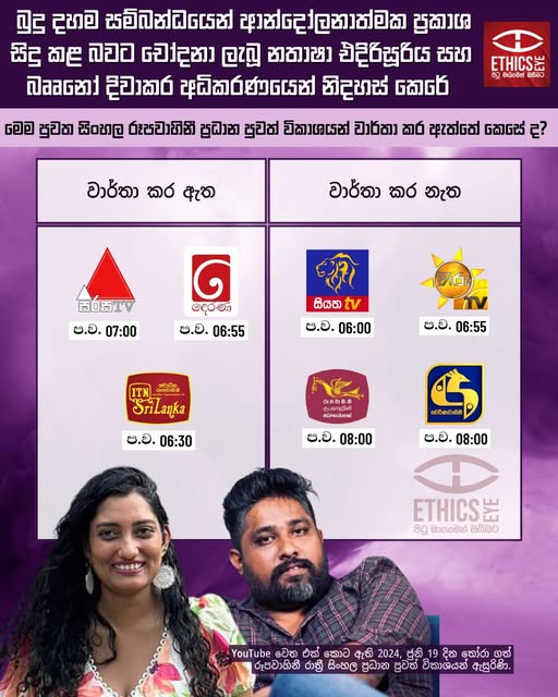 On June 19, 2024, the Colombo Fort Magistrate acquitted Nathasha Edirisooriya and Bruno Diwakara, stating that there was insufficient evidence to charge them under the International Covenant on Civil and Political Rights (ICCPR) Act for an alleged statement deemed offensive to Buddhist society. Sirasa, TV Derana, and ITN reported the news in their main Sinhala news bulletins, while Siyatha, Hiru TV, Rupavahini, and Swarnavahini did not cover it.