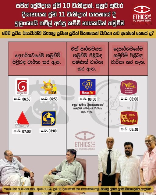 On June 11, 2024, TV Derana, Hiru TV, Sirasa, Swarnawahini, Siyatha, Rupavahini and ITN television channels reported on the meetings held between ITAK leaders, Sajith Premadasa, the leader of the Samagi Jana Balawegaya, and Anura Kumara Dissanayake, the leader of the Jathika Jana Balawegaya. TV Derana, Hiru TV, Sirasa, and Swarnawahini covered the meetings of both parties during their prime-time Sinhala news bulletins, while Rupavahini and ITN did not report on either meeting. Siyatha reported only on the meeting between ITAK and Anura Kumara Dissanayake.