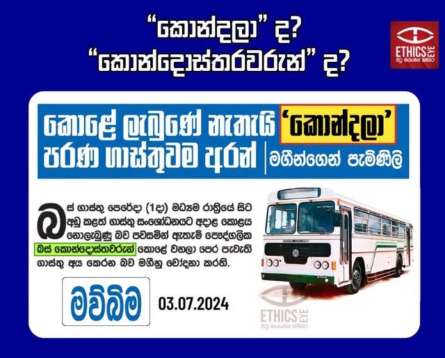 On July 3, 2024, the Mawbima newspaper reported a complaint from passengers against a bus conductor for charging incorrect fares. The headline used the derogatory term “Kondala” (කොන්දලා), which can stereotype and marginalise the profession and is considered unethical. However, in the article content, Mawbima used the appropriate term “Kondostharavarun” (කොන්දොස්තරවරුන්). Media is advised to maintain neutrality and avoid language that negatively highlights any profession.