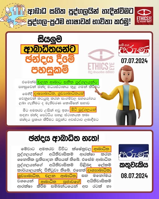 On July 07, 2024, Sathi Aga Aruna, and on July 08, 2024, Aruna newspapers reported on efforts to facilitate voting for people with disabilities. The Sathi Aga Aruna headline used the derogatory term “Abadhitha” (ආබාධිත), and both newspapers used the terms such as “Abadhitha” (ආබාධිත), “Drushyabaditha” (දෘශ්යාබාධිත), “Shrawanabaditha” (ශ්රවනාබාධිත), “Chalana Abadhitha” (චලන ආබාධිත), and “Miti Pudgalayan” (මිටි පුද්ගලයන්), which may contribute to the marginalisation of people with disabilities, including those with dwarfism, and are considered unethical. However, Sathi Aga Aruna also used the more appropriate term “Chalana Abadha Sahitha Pudgalayan” (චලන ආබාධ සහිත පුද්ගලයන්). Media is advised to maintain neutrality, use person first language, and avoid terms that negatively highlight disabilities or promote marginalisation.