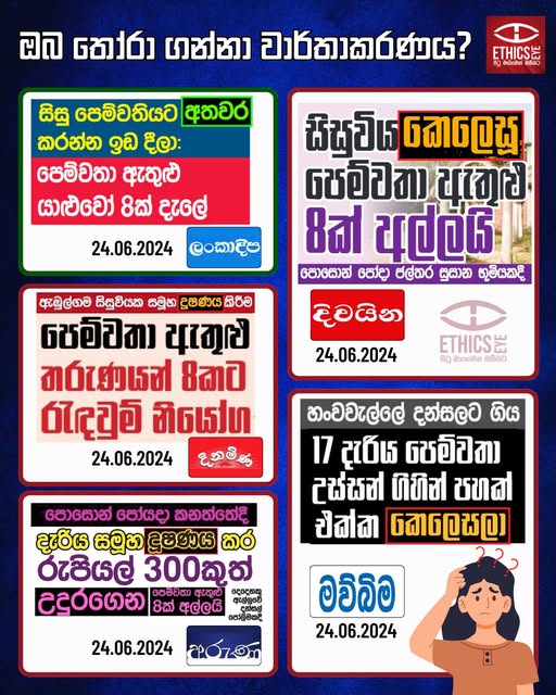 On June 24, 2024, Lankadeepa, Divaina, Dinamina, Mawbima, and Aruna reported an incident involving the gang rape of a female student. While Lankadeepa used the appropriate term “athawara” (අතවර), the other newspapers used derogatory terms such as “kelesu” (කෙලෙසූ) and “dushanaya” (දූෂණය) in their headlines, which can intensify negative attitudes and behaviours. Using such terms in headlines marginalises victims of sexual crimes and is considered unethical.