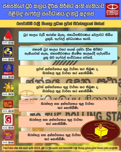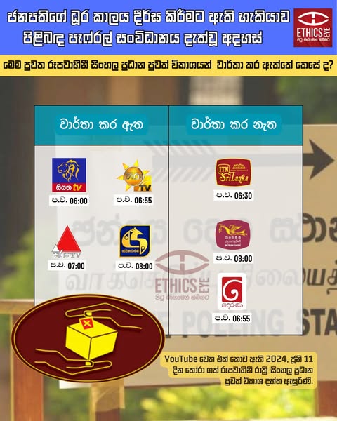 On June 11, 2024, the Siyatha, Hiru TV, Sirasa, Swarnawahini, ITN, Rupavahini and TV Derana television channels reported PAFFREL’s position of the People's Action for Free and Fair Elections (PAFFREL) organisation that the presidential election should be held as scheduled in accordance with the Constitution, as there is no provision to extend the President’s term to six years. Siyatha, Hiru TV, Sirasa, and Swarnawahini carried the story, while ITN, Rupavahini and TV Derana did not. Among those that reported it, only Sirasa and Swarnawahini included the story in their prime-time Sinhala news bulletins.