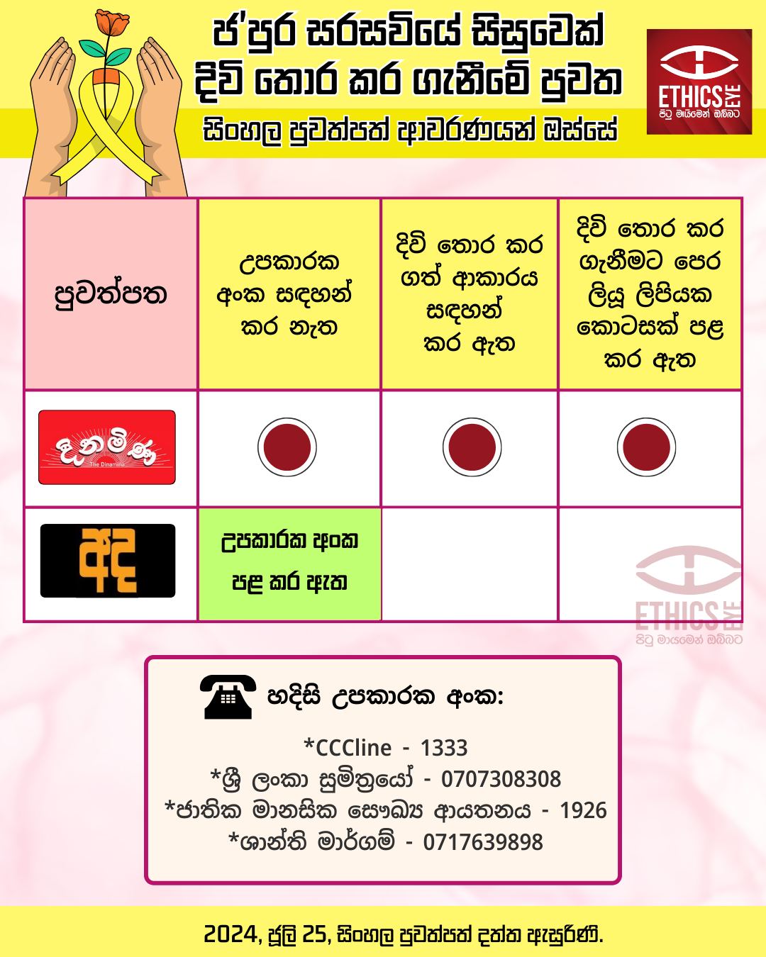This infographic shows how a suicide incident of a schoolgirl in Welipanna area was reported in the Sinhala newspapers published on July 15, 2024. Without following media ethical guidelines, Ada, Aruna and Dinamina have ...