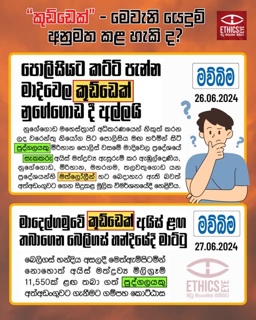 On June 26 and 27, 2024, the Mawbima newspaper published two reports that used the derogatory term “Kuddek” (කුඩ්ඩෙක්) in their headlines and used “Mathlolin” (මත්ලෝලීන්) in the content to refer to drug users and drug traffickers which is unethical. However, the appropriate terms “Pudgalayaku” (පුද්ගලයකු) and “Sakakaru” (සැකකරු) were used in the content of the same news. Using such language in a negative context increases the stigma faced by people who use drugs. It also makes it difficult for them to reintegrate into society after rehabilitation and becomes an obstacle to addressing drug-related social problems.