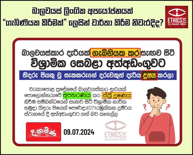 On July 09, 2024, the Dinamina newspaper reported an alleged case of abuse involving a minor girl and a retired army officer. The headline used the trivialising phrase “Gabiniyaka kara” (ගැබිනියක කර), and the content included the terms “Dushya” (දූෂ්‍ය) and “Sthri duushanaya” (ස්ත්‍රී දූෂණය), as well as the appropriate term “Apaharanaya” (අපහරණය). While legal texts use the term rape for sexual crimes, such language can suggest the term rape is used in legal texts to refer to sexual crimes, such terminology can imply that victims are defiled, thereby reinforcing stigma, discrimination, and social hostility toward those subjected to such crimes. Using such language is unethical, because it normalises the offence and downplays its seriousness. Media are advised to avoid derogatory or such trivialising language, especially in sensitive contexts, to maintain ethical reporting standards.