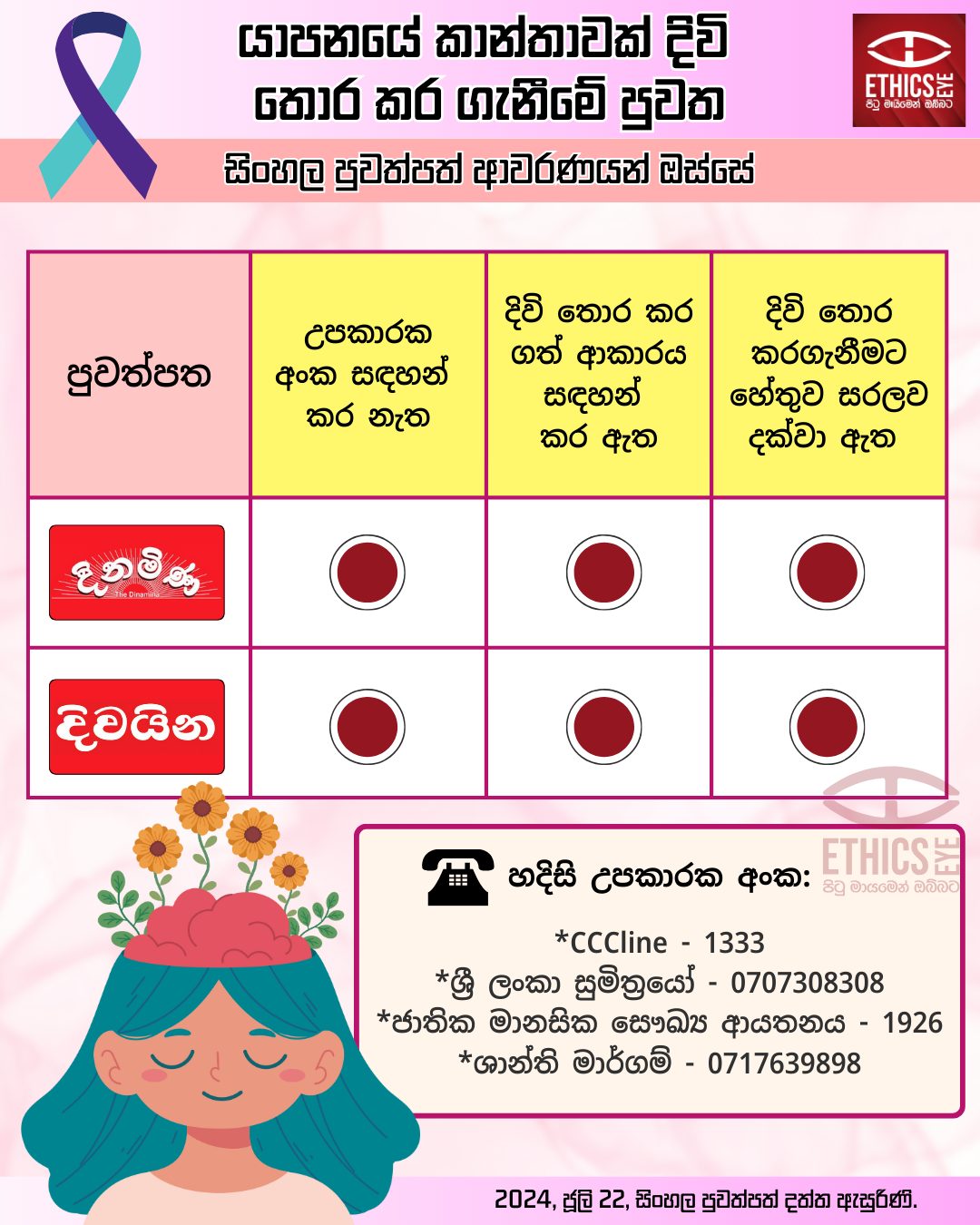 On July 22, 2024, Dinamina and Divaina newspapers reported on the suicide of a woman in Jaffna. Both newspapers published the story without mentioning any helplines and described the method and oversimplified reasons for the suicide, which violates media ethical guidelines.