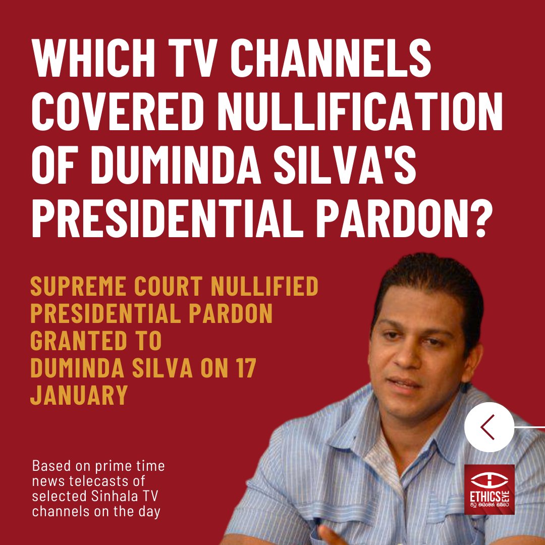 On January 17, 2024, the Supreme Court ordered the invalidation of the presidential pardon granted by former President Gotabaya Rajapaksa to former Parliamentarian Duminda Silva, who had been sentenced to death and imprisoned for the murder of Bharatha Lakshman Premachandra. Sirasa, TV Derana, Rupavahini, Swarnawahini, ITN, and Siyatha reported this story on the same day during their prime Sinhala news bulletins, whereas Hiru TV did not cover the story.