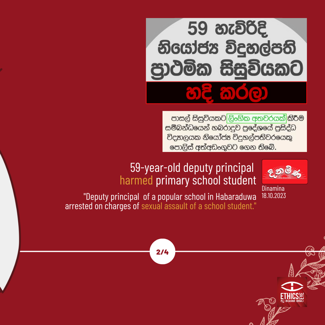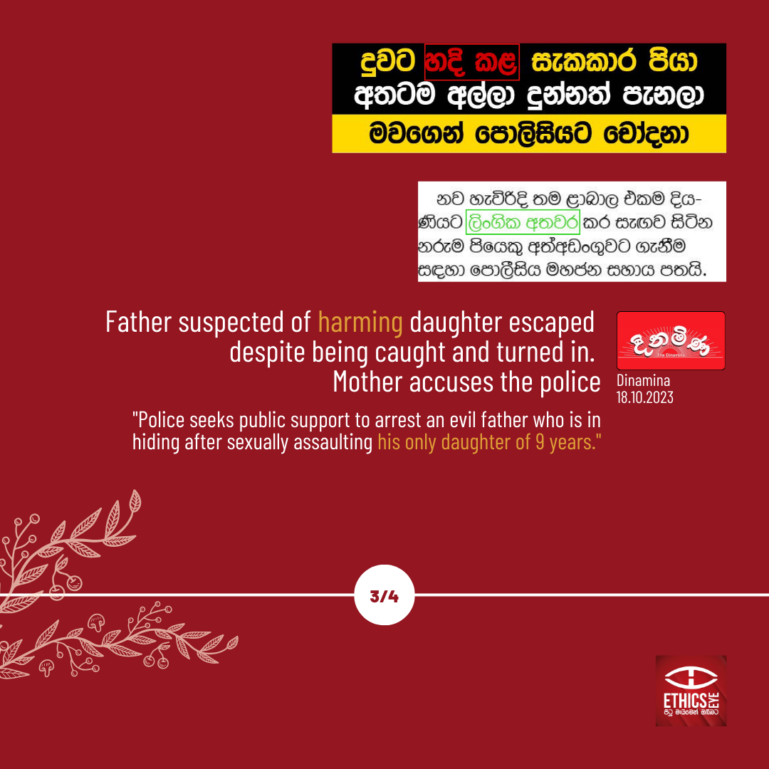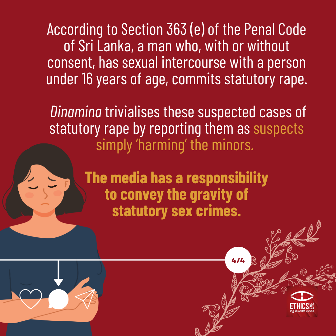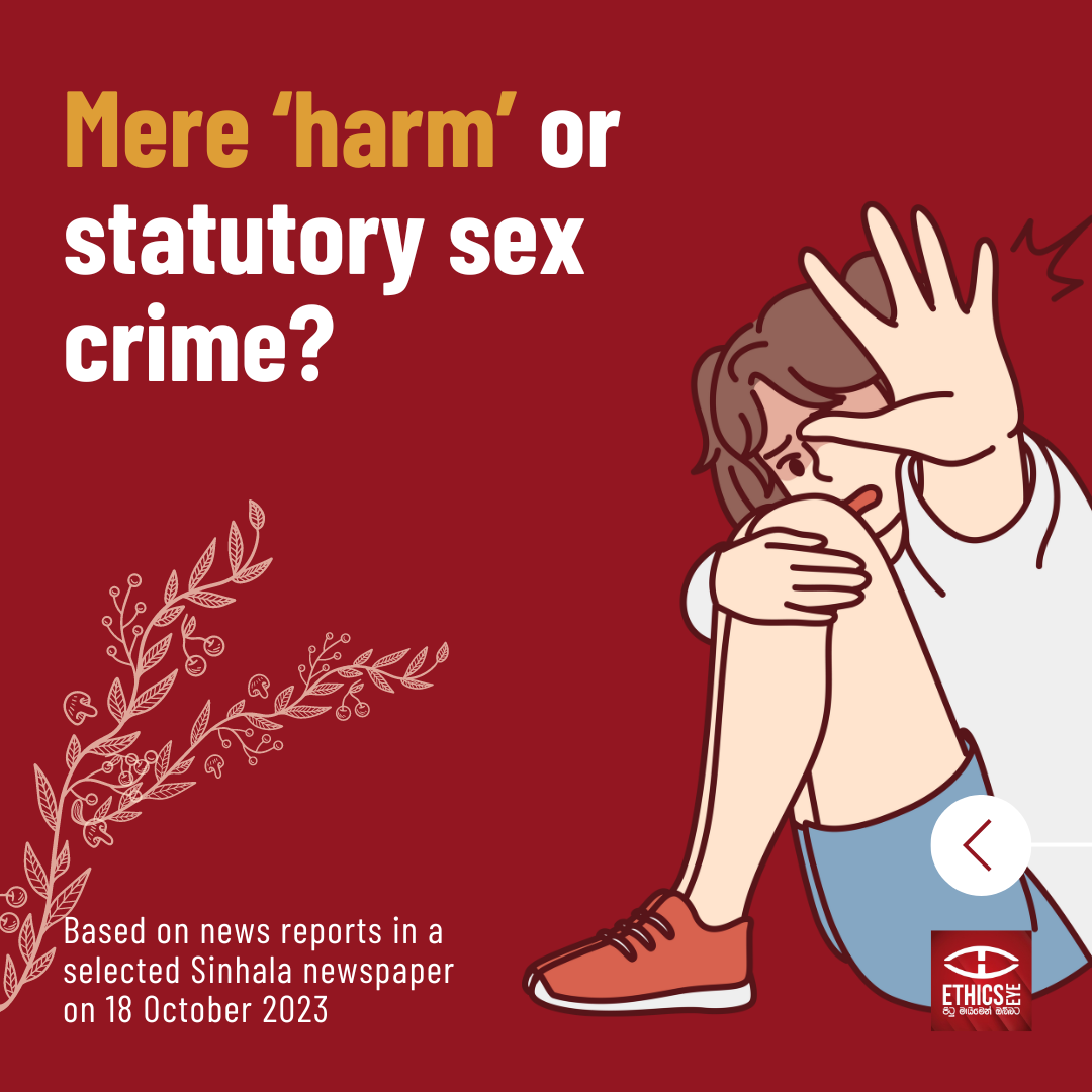 On October 18, 2023, Dinamina newspaper reported two incidents: the sexual assault of a primary school student by a deputy principal and of a nine-year-old girl by her father. Dinamina described these suspected cases of statutory rape as suspects merely ‘harming’ the minors. The media has a responsibility to accurately convey the seriousness of statutory sex crimes, and this reporting did not meet established ethical guidelines.