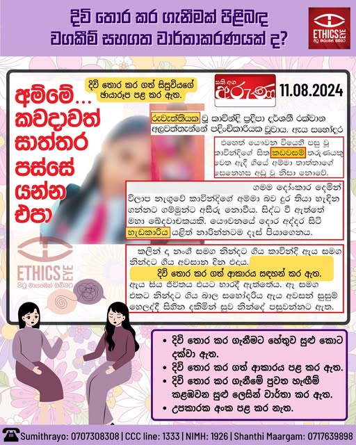 Ethics Eye (Colombo: Verité Research, 2024-01-22)On January 18, 2024, Dinamina and Divaina newspapers published articles on a crime involving three individuals. However, both reports disproportionately highlighted the woman in their headlines and content, despite the ...