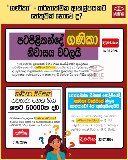 On 14 August 2024 Dinamina and on 23 July 2024 Divaina reported on raids of sex service establishments, using the derogatory term “ගණිකා නිවාස” in both headlines and content. In its 31 July 2024 report on the arrest of four sex workers, Divaina also used the term “ගණිකා වෘත්තියේ” in both the headline and content. Stigmatizing attitudes in society linked to the term "prostitute" increase marginalisation and worsen the social problems they face. The media is encouraged to avoid such derogatory terms and instead use "ලිංගික ශ්‍රමිකයා" (sex workers), "ලිංගික සේවය" (sex service), or "ලිංගික සේවා සපයන ස්ථාන" (sex service centres).