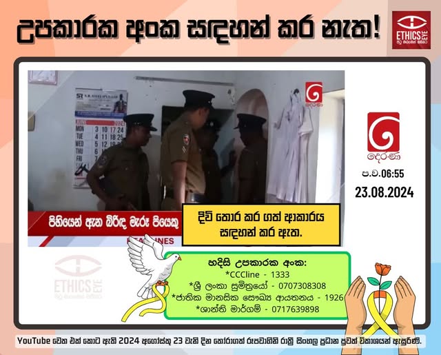 On 23 August 2024, TV Derana reported a suicide on its main evening news, omitting emergency helpline numbers and describing the method used. The media is encouraged to follow ethical guidelines when reporting on murders and suicides. Avoiding detailed descriptions of suicide methods and including emergency helpline numbers can help prevent copycat incidents and direct those at risk to counseling support.