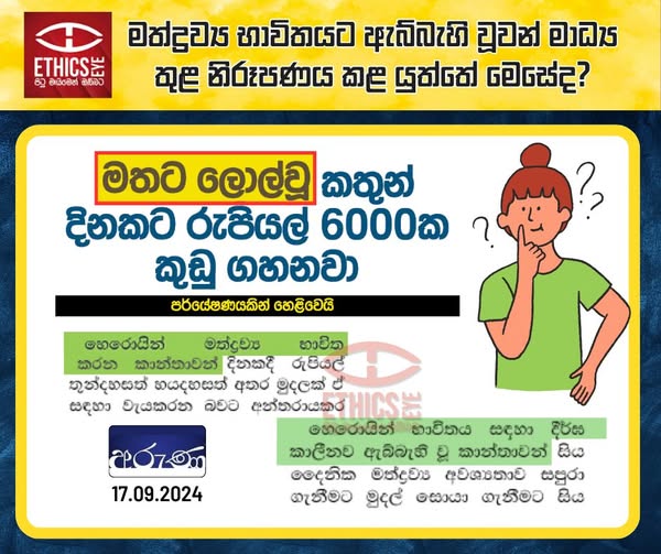 On 17 September 2024, Aruna newspaper reported an investigative report on women who use drugs using the derogatory term "මතට ලොල්වූ" (mathata lolvu) in its heading. However, in the content it used the appropriate term "මත් ද්රව්ය භාවිතා කරන" (drug users).